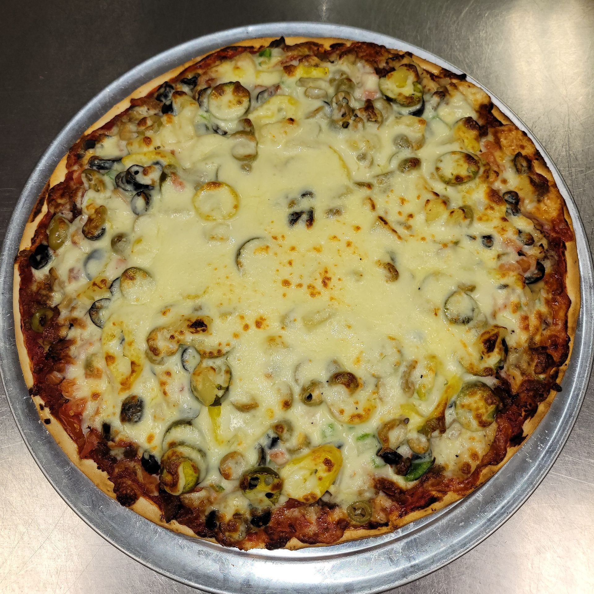Mushroom, onion, tomato, green pepper, black olive, banana pepper